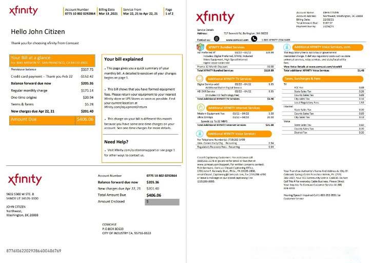 USA San Francisco Xfinity Comcast utility bill template in Word and PDF format (2 pages) download template file