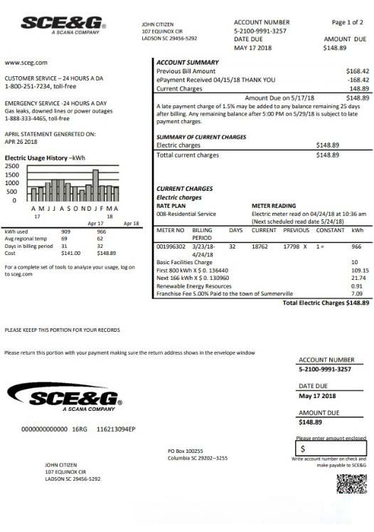 USA South Carolina SCE&G electricity utility bill template in Word and PDF format download template file