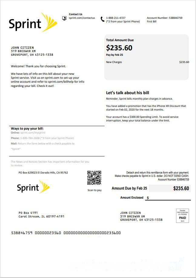 USA Sprint (T Mobile) utility bill template in Word and PDF format download template file