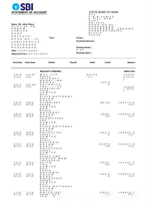 USA State Bank of India bank statement Word and PDF template, 3 pages download template file