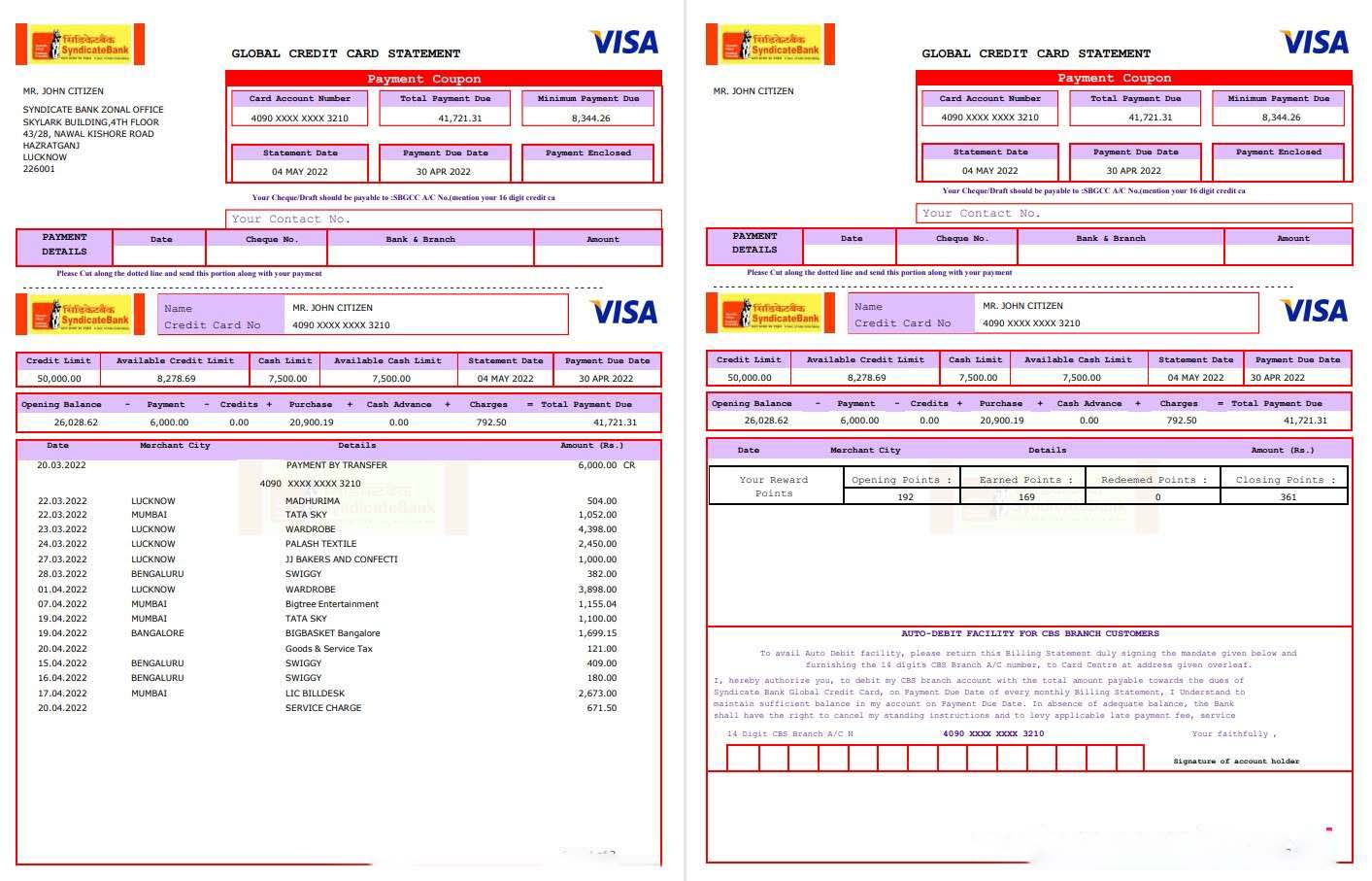 USA Syndicate bank credit card statement 3 pages download template file
