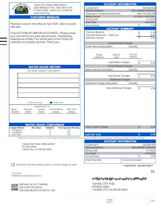 USA TAHOE CITY PUBLIC UTILITY utility bill Word and PDF template download template file