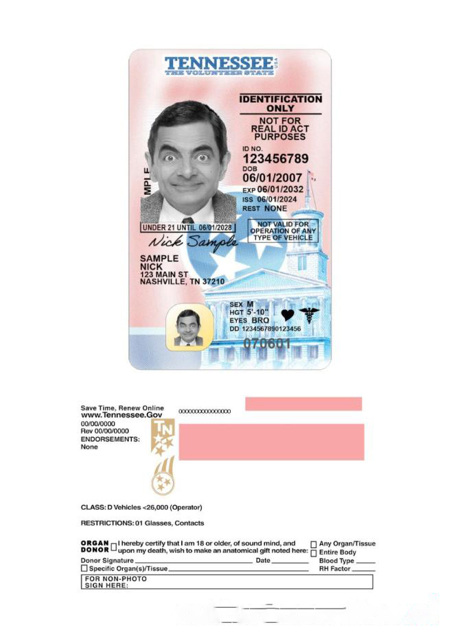 USA Tennessee under 21 Driving License 2024 present download template file