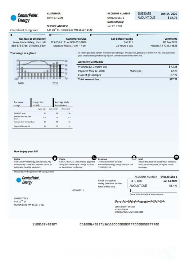 USA Texas Center Point Energy utility bill template in Word and PDF format download template file