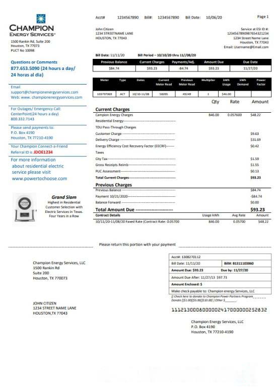 USA Texas Champion Energy Services proof of address utility bill template in Word and PDF format download template file