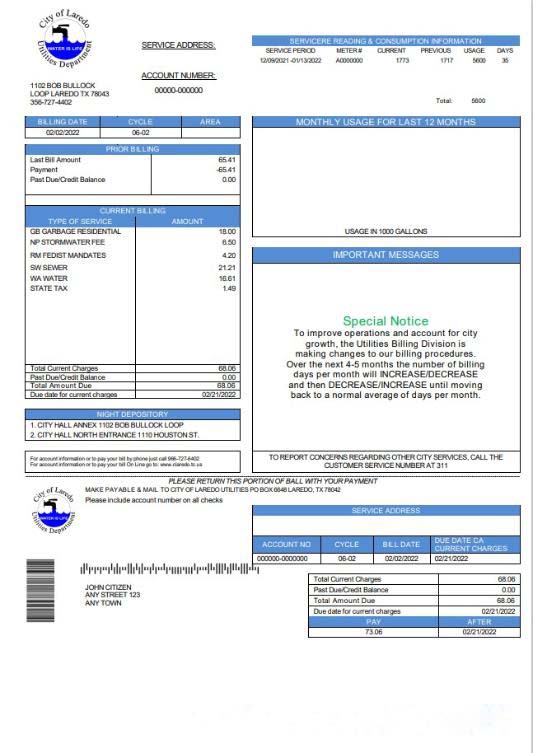 USA Texas City of Laredo Utilities Department water utility bill template in Word and PDF format download template file