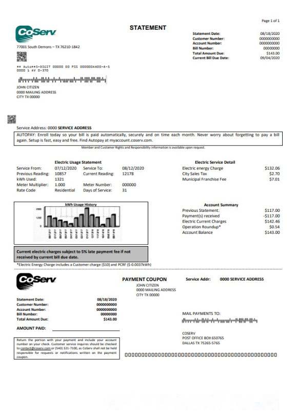 USA Texas CoServ utility bill template in Word and PDF format download template file