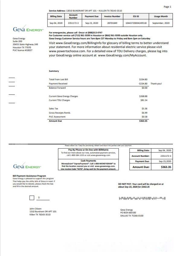USA Texas Gexa Energy utility bill template in Word format download template file