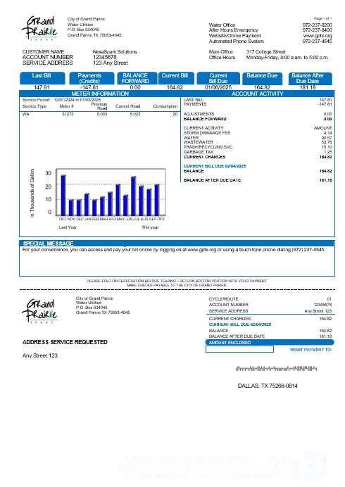 USA Texas Grand Prairie business utility bill template in Word and PDF formats download template file