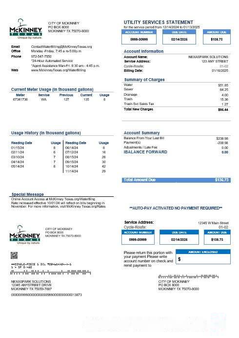 USA Texas McKinney business utility bill template in Word and PDF formats download template file