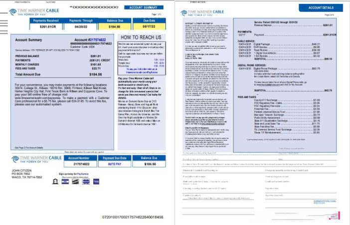 USA Time Warner Cabel utility bill, Word and PDF template, 3 pages 1 2 download template file