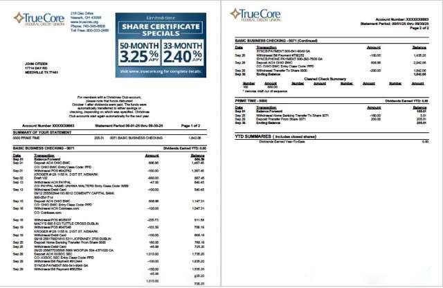USA TrueCore Federal Credit Union account statement Word and PDF template, 2 pages download template file