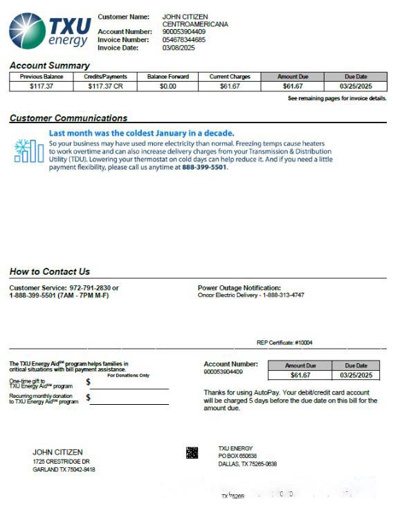 USA TXU Energy utility bill template in Word and PDF formats, version 4 download template file
