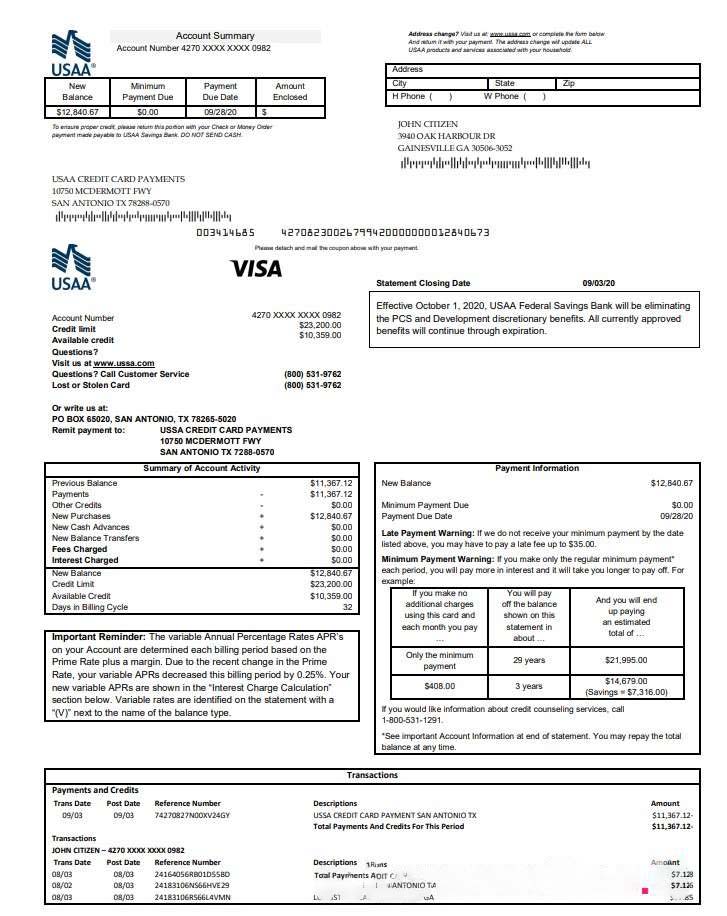 USA USAA bank Credit card statement download template file