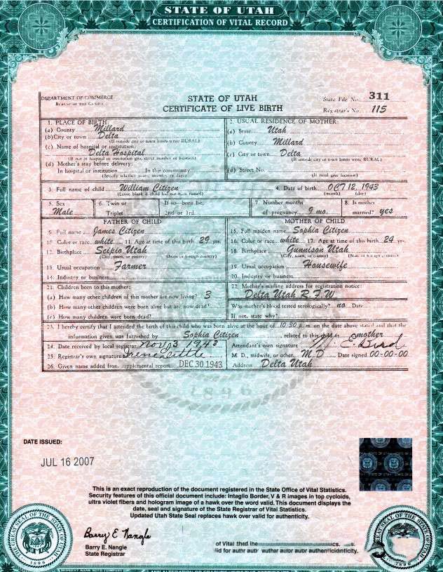 USA Utah state birth certificate template in PSD format download template file