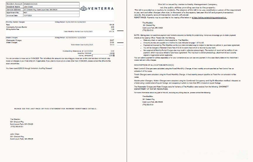 USA Venterra utility bill template in Word and PDF formats, 2 pages download template file