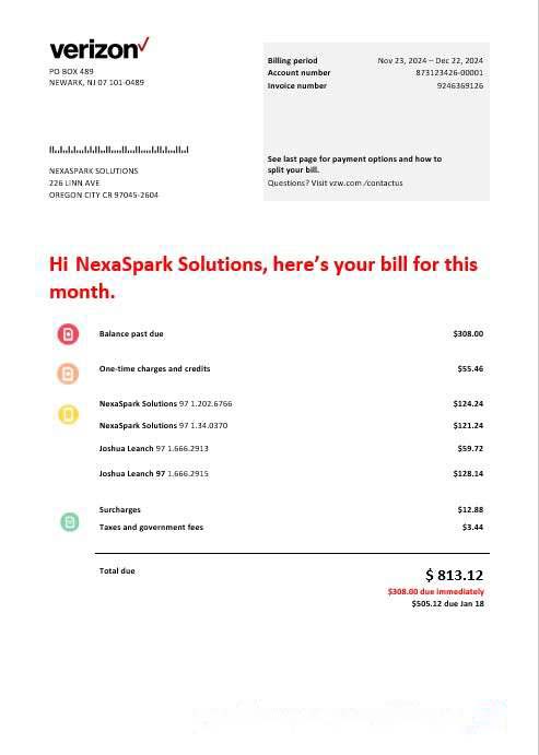 USA Verizon telecommunications business utility bill template in Word and PDF formats download template file