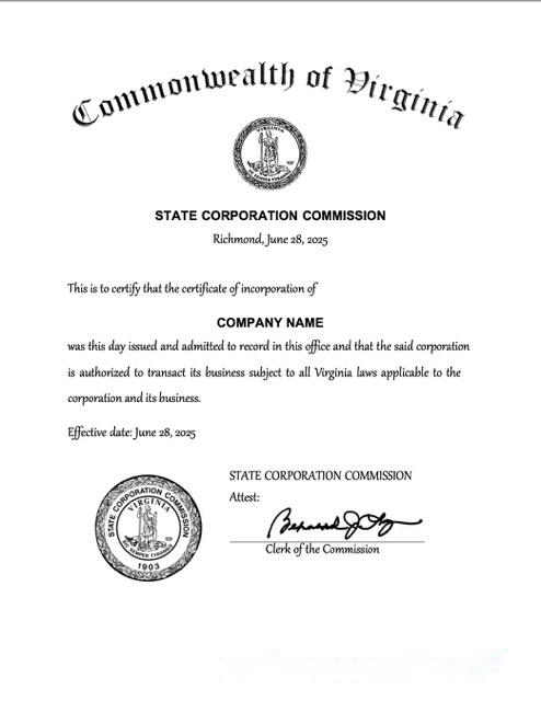 USA Virginia certificate of incorporation Word and PDF template download template file