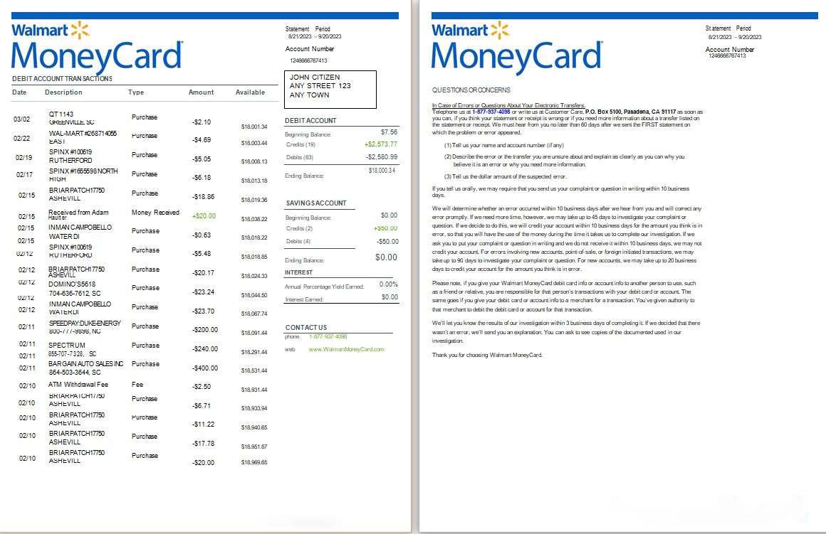 USA Walmart MoneyCard bank statement Word and PDF, 2 pages download template file