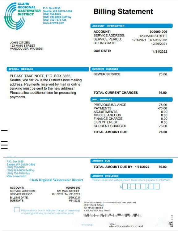 USA Washington Clark Regional Wastewater District utility bill, Word and PDF template download template file