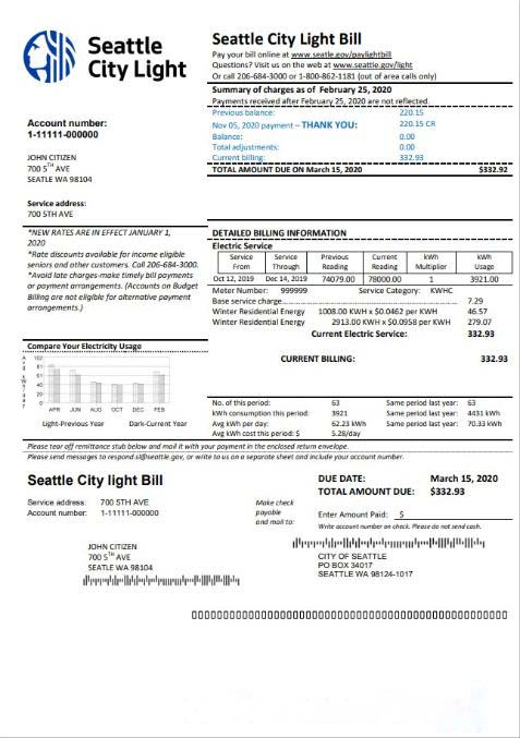 USA Washington Seattle City Light utility bill template in Word and PDF format download template file