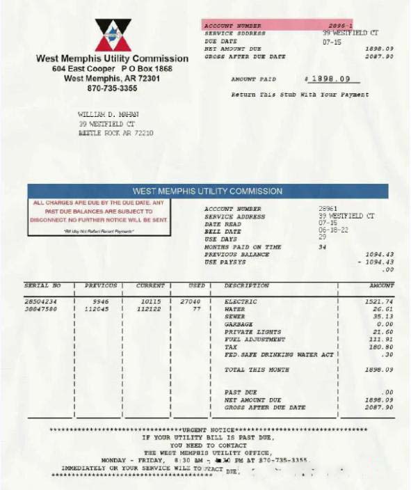 USA WEST MEMPHIS UTILITY COMMISSION utility bill Word and PDF template download template file