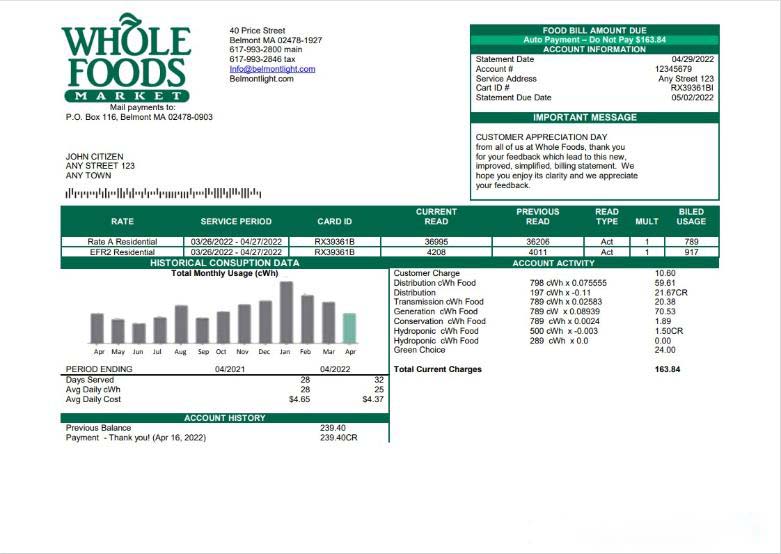 USA Whole Foods Market utility bill template in Word and PDF format download template file