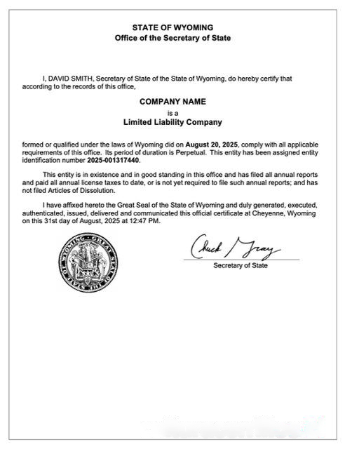USA Wyoming certificate of registration Word and PDF template, version 2 download template file