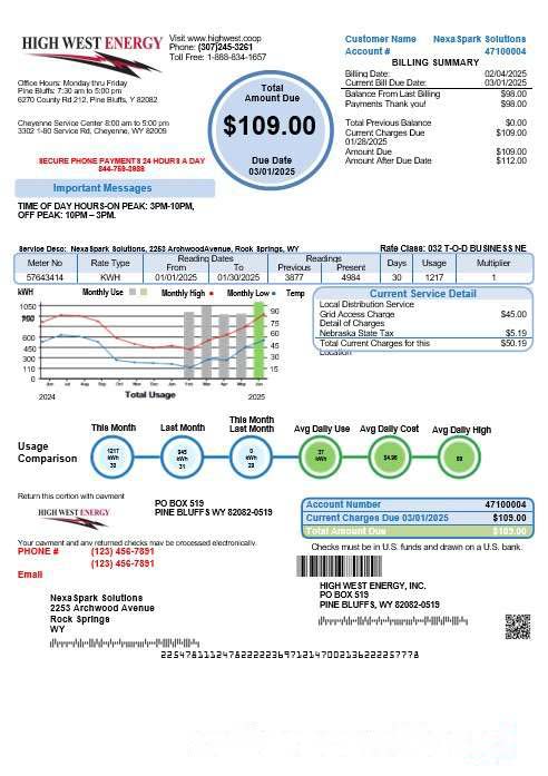 USA Wyoming High West Energy business utility bill in Word and PDF formats, version 2 download template file