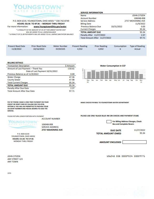 USA Youngstown Water Department utility bill template in Word and PDF format download template file