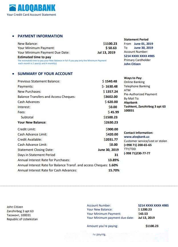 Uzbekistan Aloqabank proof of address statement template in Word and PDF format download template file