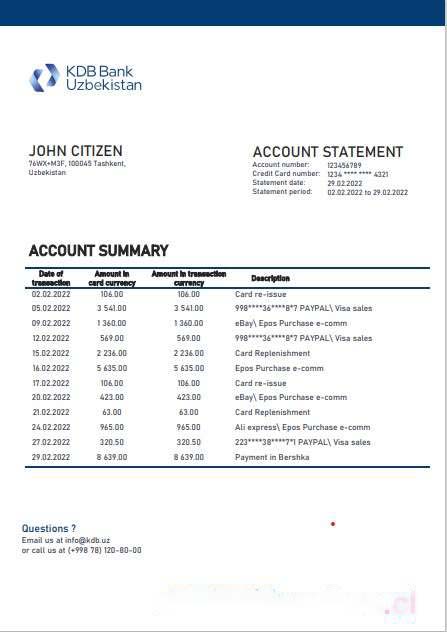 Uzbekistan KDB Bank statement template in Word and PDF format download template file