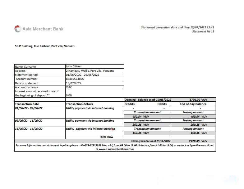 Vanuatu Asia Merchant bank statement, Excel and PDF format download template file