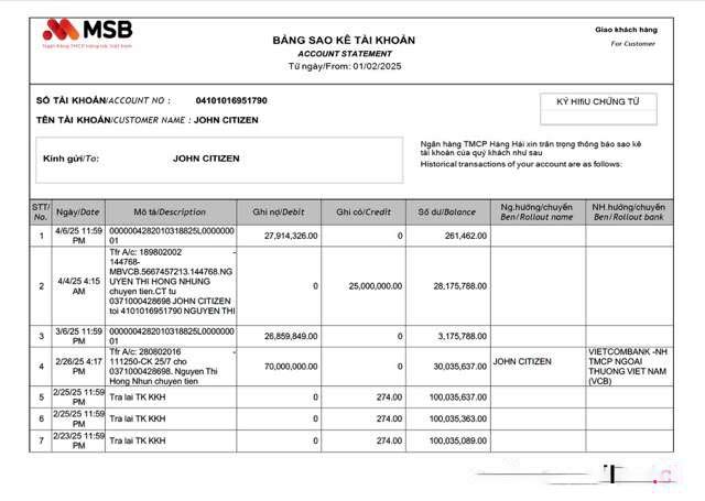 Vietnam MSB Bank account statement Word and PDF template download template file