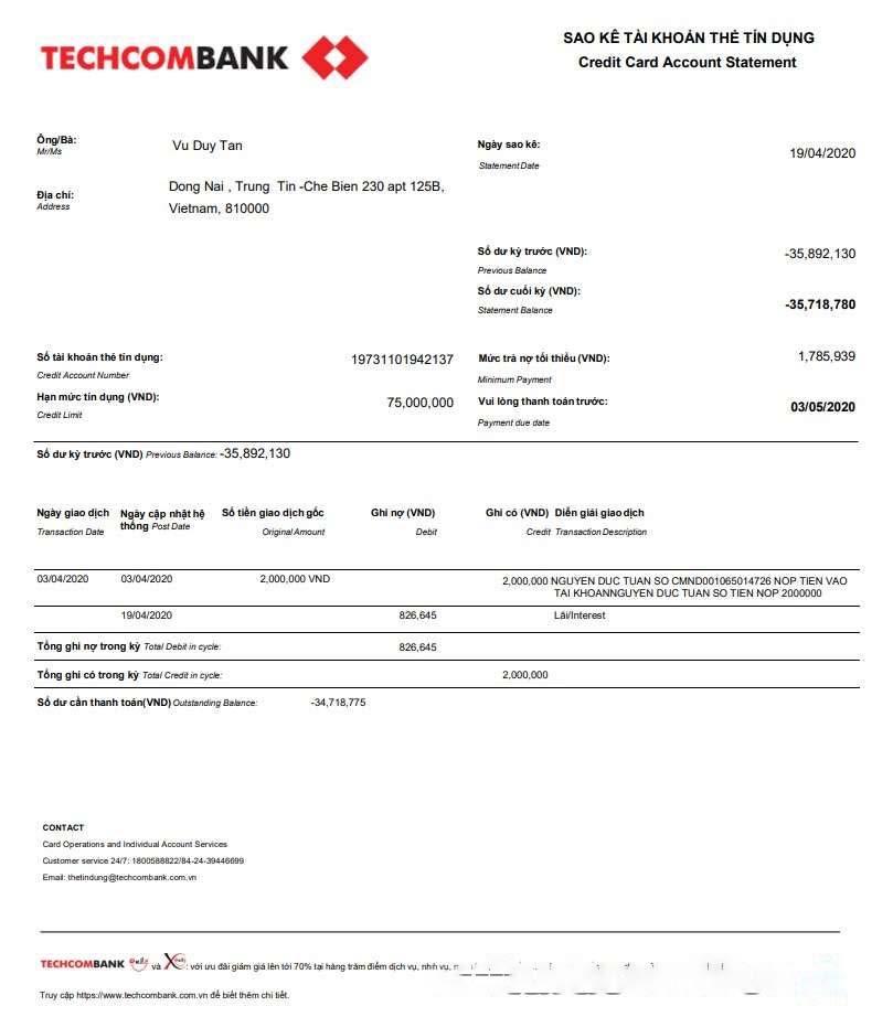 Vietnam Techcombank statement download template file