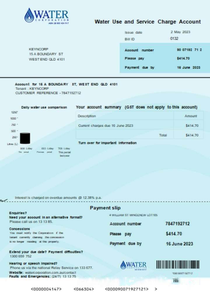 Water Corporation WA utility business bill, SCR download template file