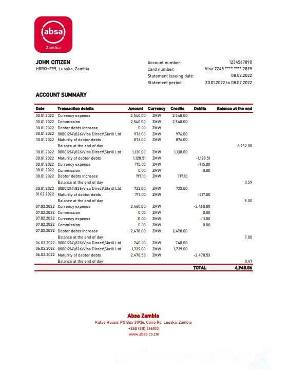 Zambia Absa bank statement, Excel and PDF template download template file