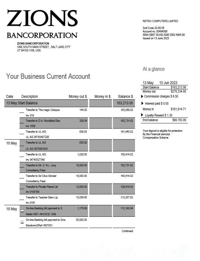 Zions Bancorporation Bank business checking account statement Word and PDF template download template file